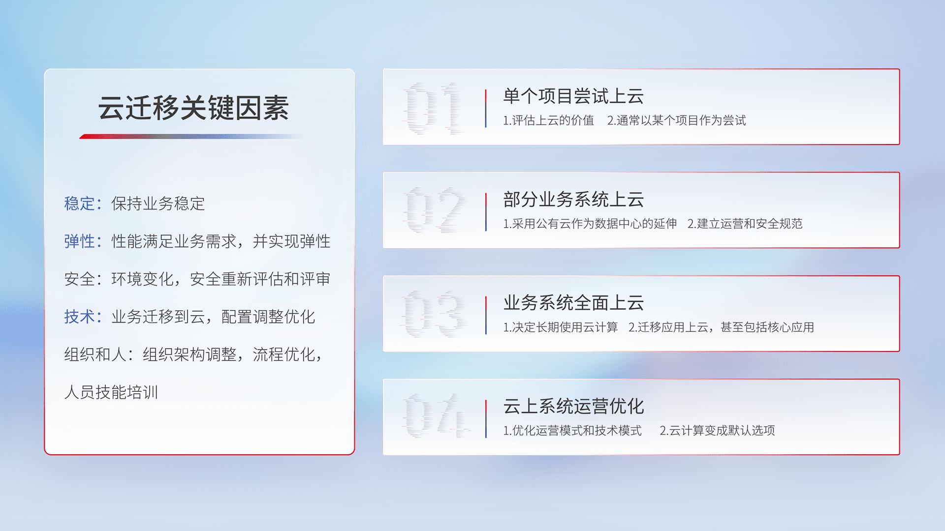 结合实际业务,,,,从规划设计、、、、云平台选型、、、云原生改造、、数据迁移、、、、集成交付,,迁移全过程为客户识别最佳上云路径,,做好风险识别管理,,,设计网络架构、、、身份权限、、安全审计合规、、操作审计、、日志审计、、、监控告警策略、、、多站点容灾设计等,,,,对云上基础设施进行整体规划,,,,提升IT治理水平,,,,以满足弹性、、、、高可用、、高性能的需求。。。。