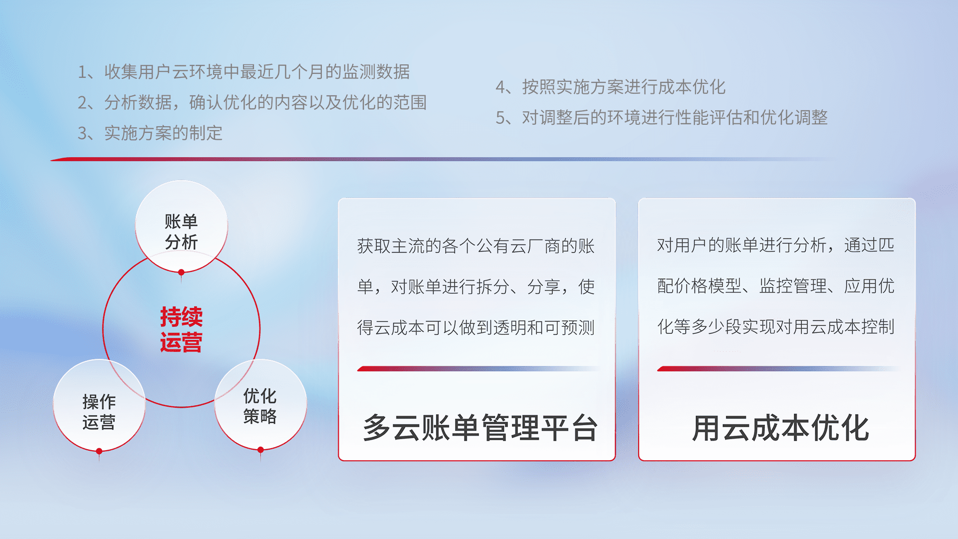 通过多云纳管,,,以统一的资源数据模型把客户的云资源进行抽象和封装,,,进而实现对多云资源的统一操作,,保障云资源管理的可靠性、、、稳定性与可用性。。。量身定制化运维内容,,,配置、、、开发运维、、、、补丁管理、、、、备份、、、、监控、、认证和访问管理、、、、审计和日常巡检等,,保障在用云过程中的可靠度,,稳定度以及高可用率。。